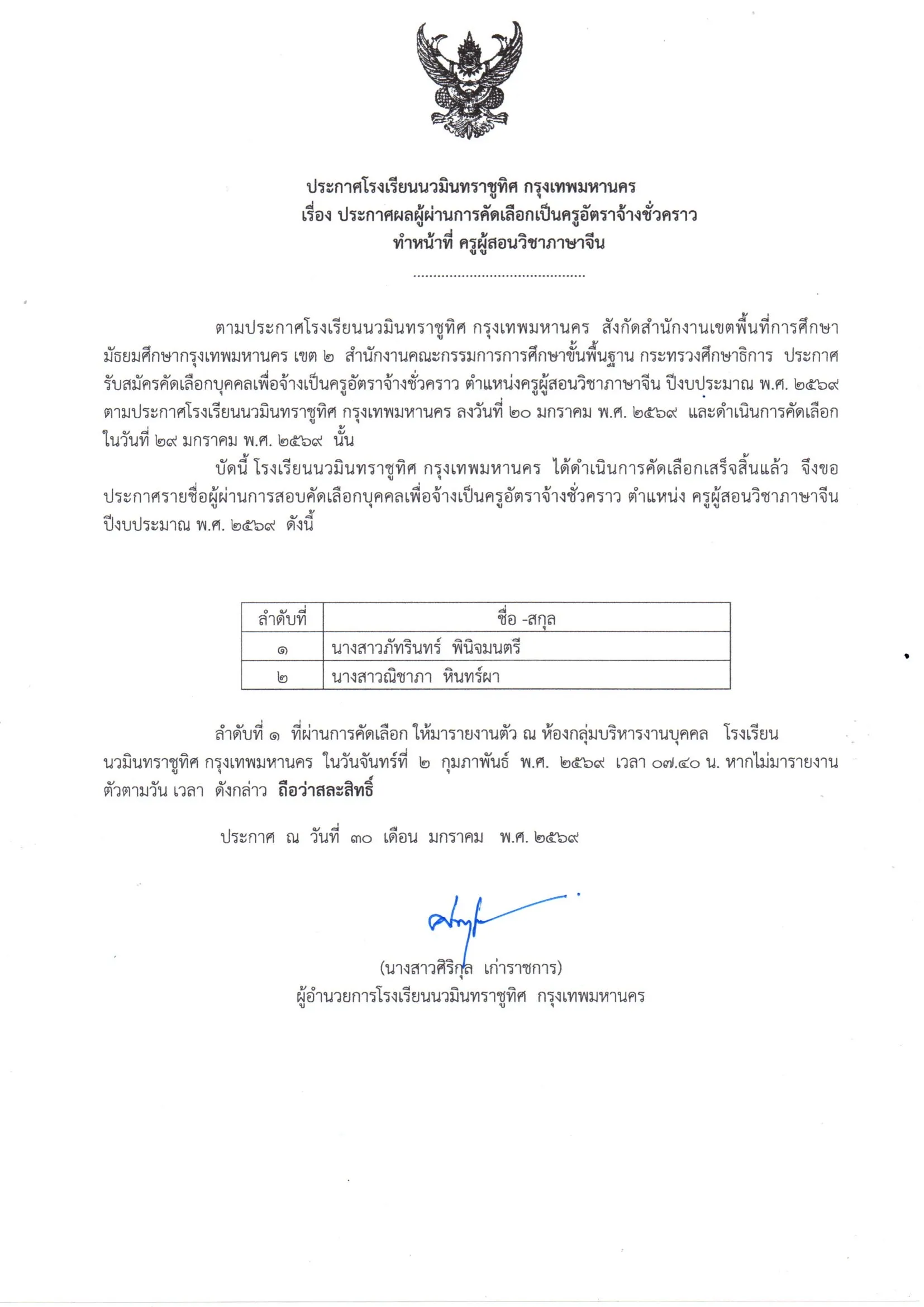 ประกาศผลผู้ผ่านการสอบคัดเลือกเป็นครูอัตราจ้างชั่วคราว ทำหน้าที่ ครูผู้สอนวิชาภาษาจีน