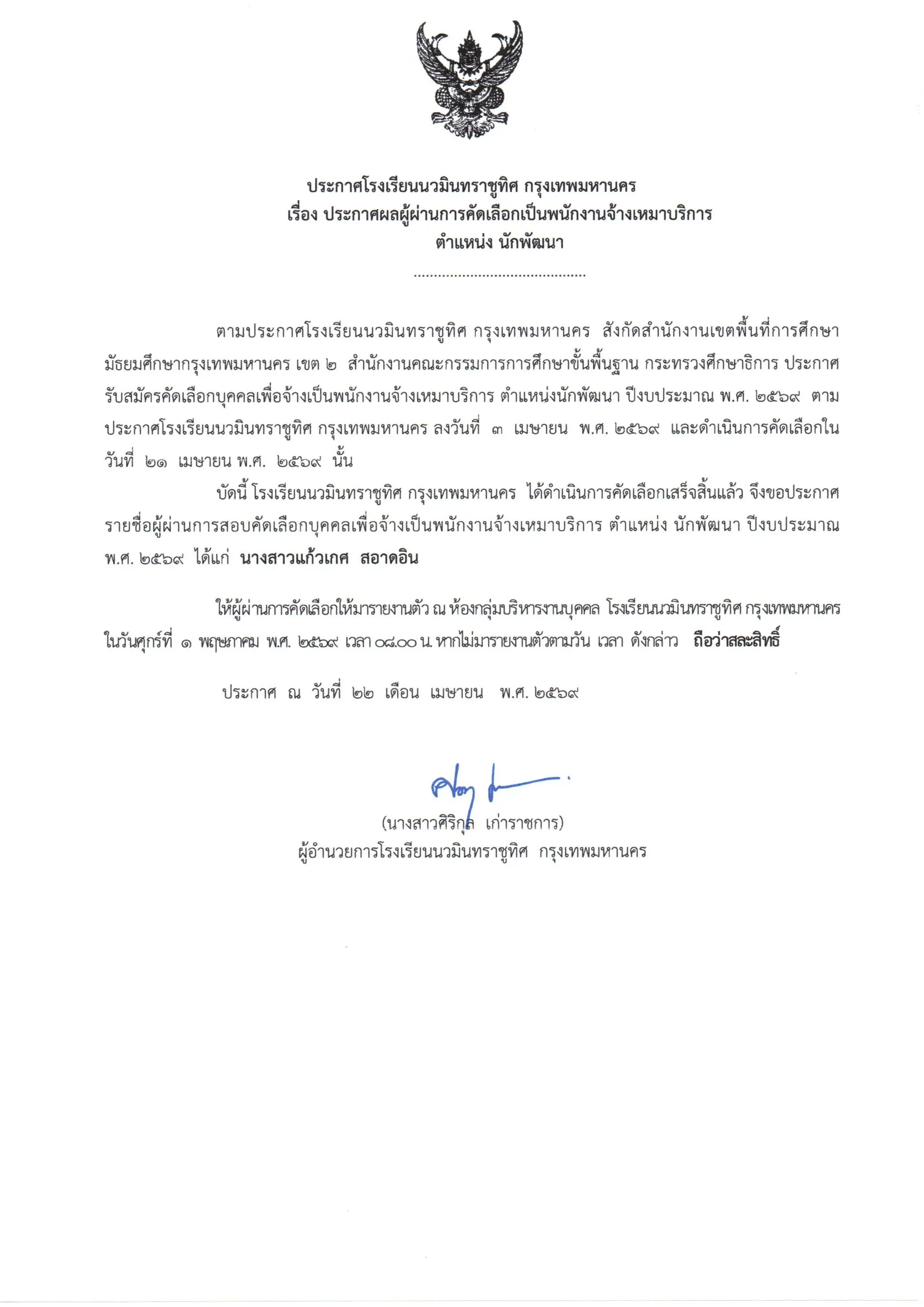 ประกาศรายชื่อนักเรียนชั้นมัธยมศึกษาปีที่ 3 ที่ผ่านการพิจารณาคัดเลือก เข้าศึกษาต่อระดับชั้นมัธยมศึกษาปีที่ 4 ประเภทโรงเรียนเดิม ปีการศึกษา 2569