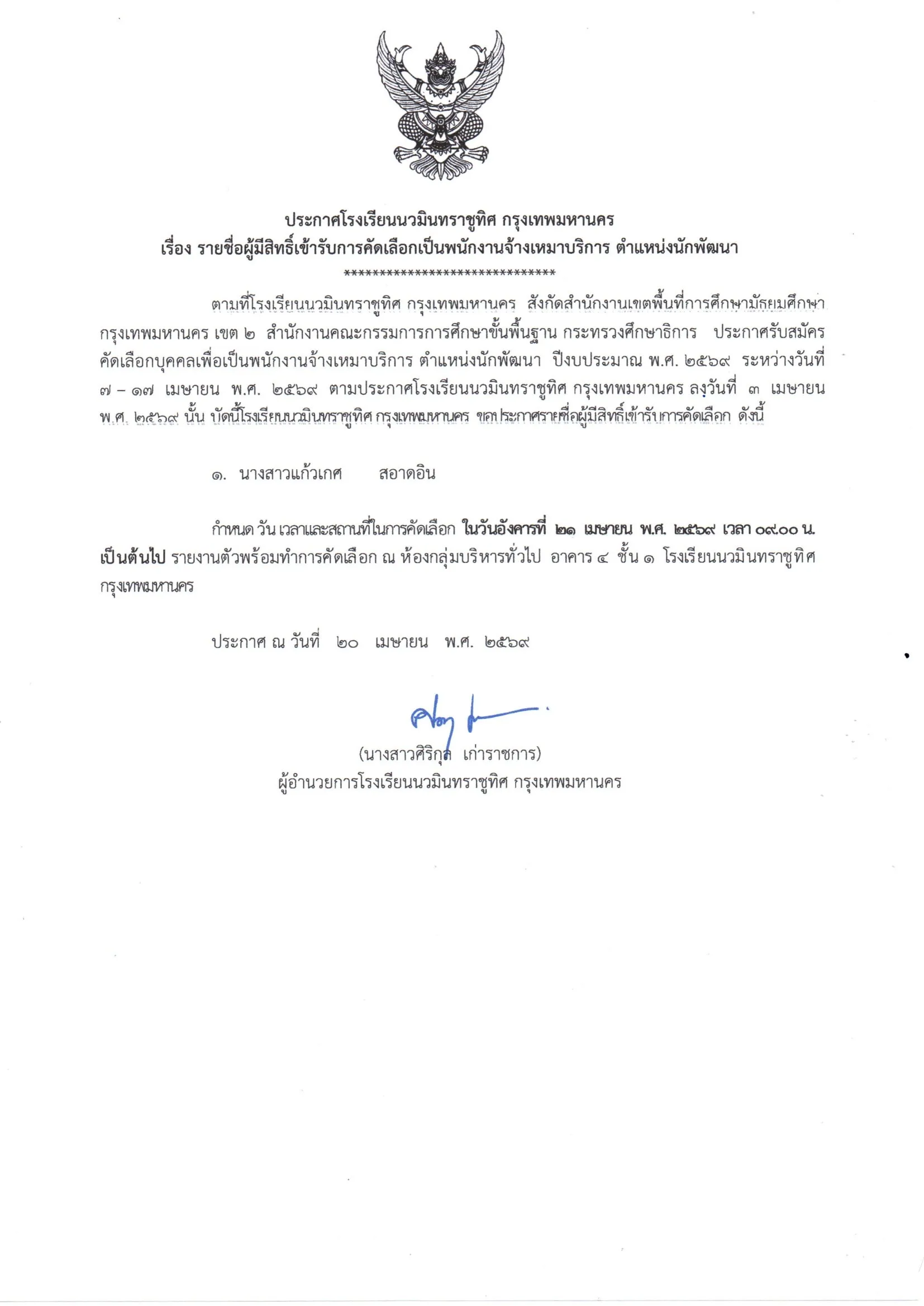 ประกาศรายชื่อ ผู้มีสิทธิ์คัดเลือกเป็นพนักงานจ้างเหมาบริการ ตำแหน่งนักพัฒนา