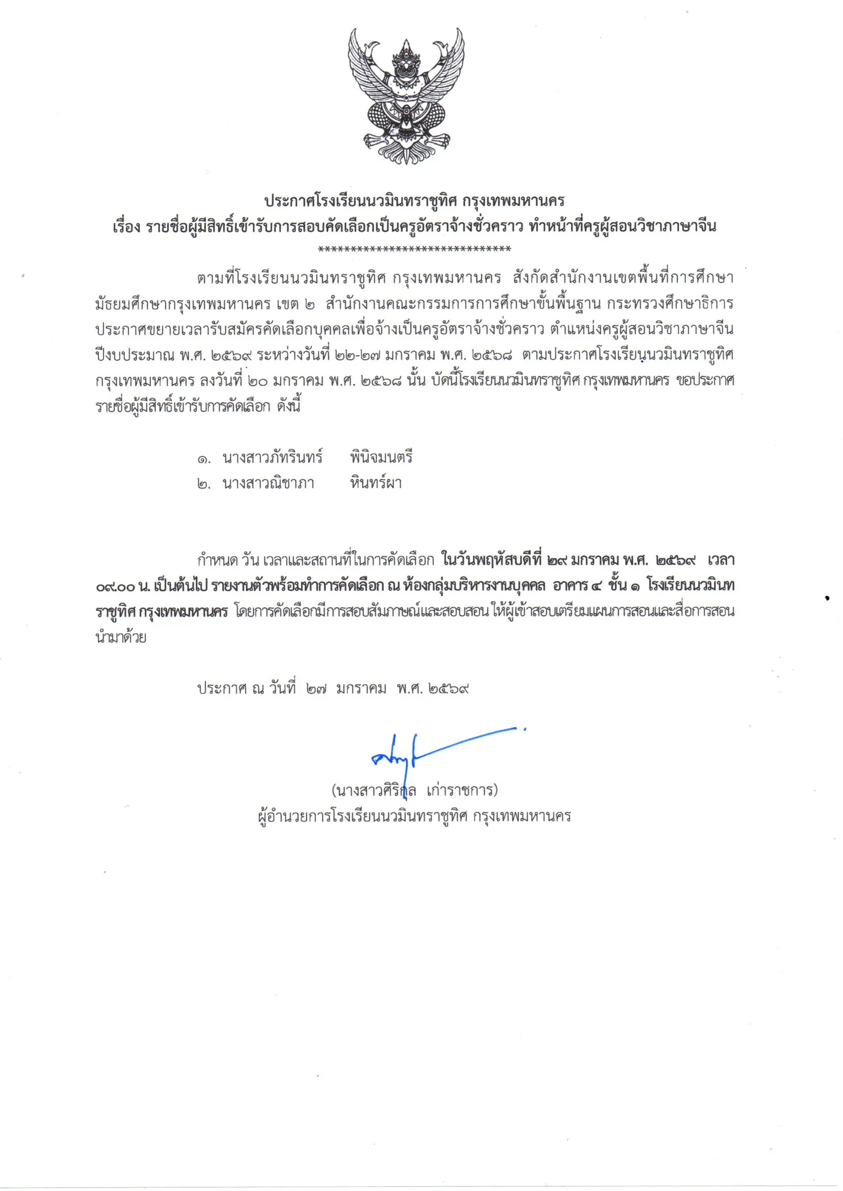 ประกาศ รายชื่อผู้มีสิทธิ์สอบคัดเลือกเป็นลูกจ้างชั่วคราว ทำหน้าที่ครูผู้สอน วิชา ภาษาจีน